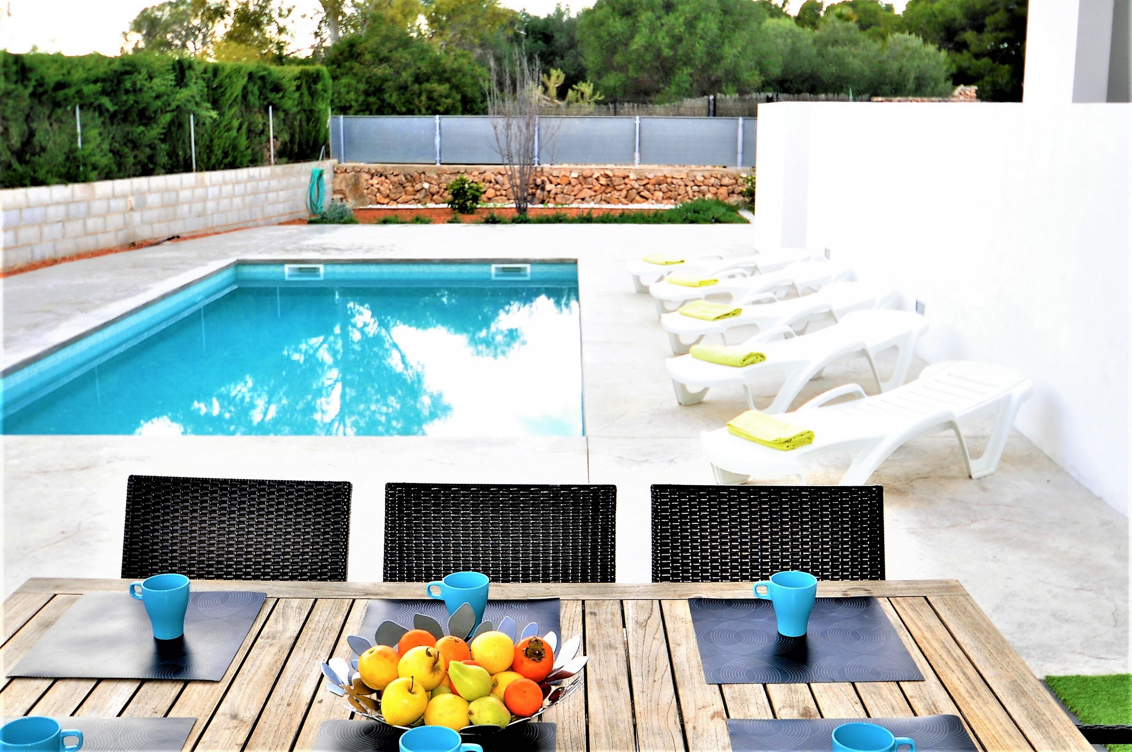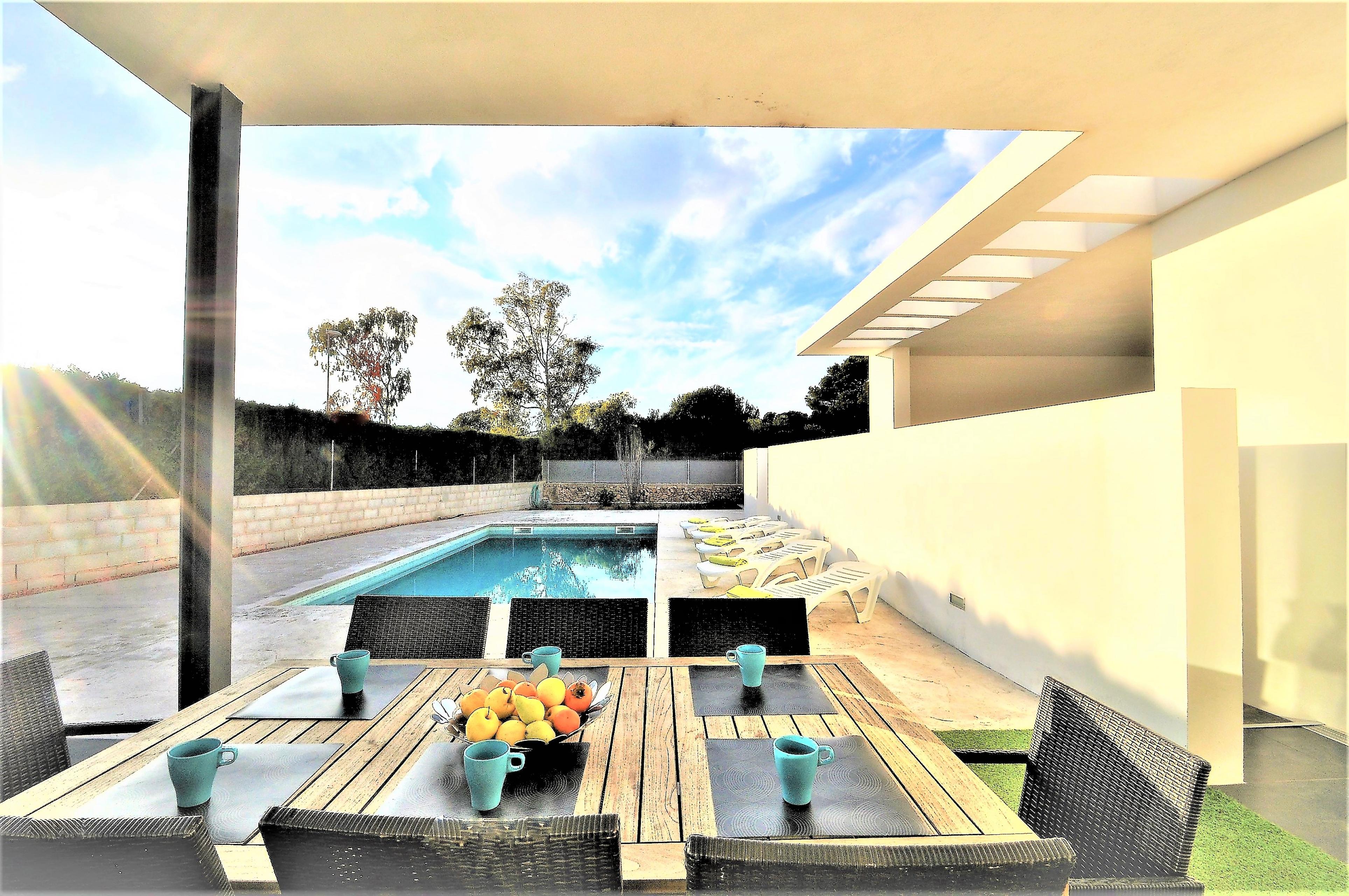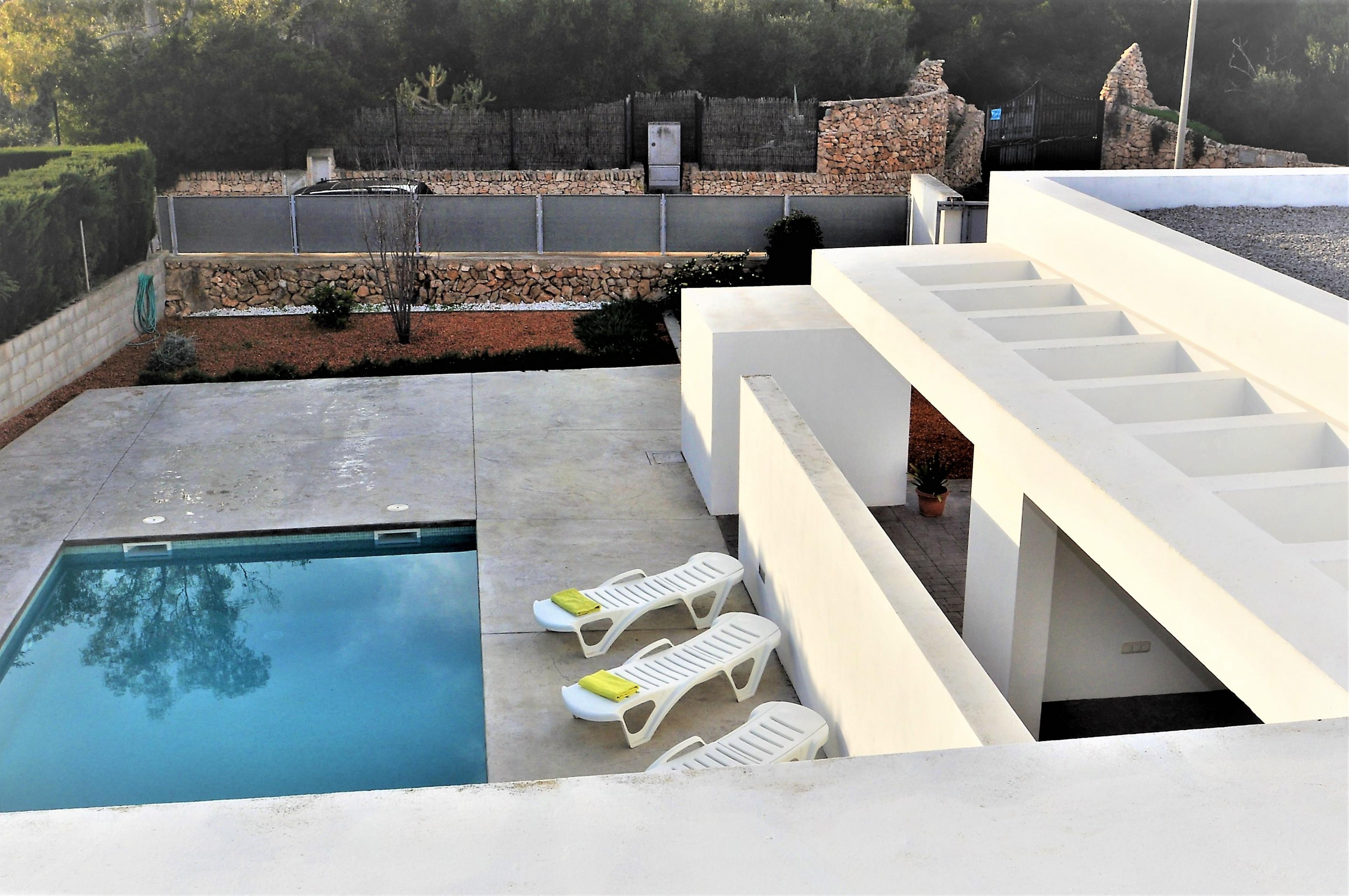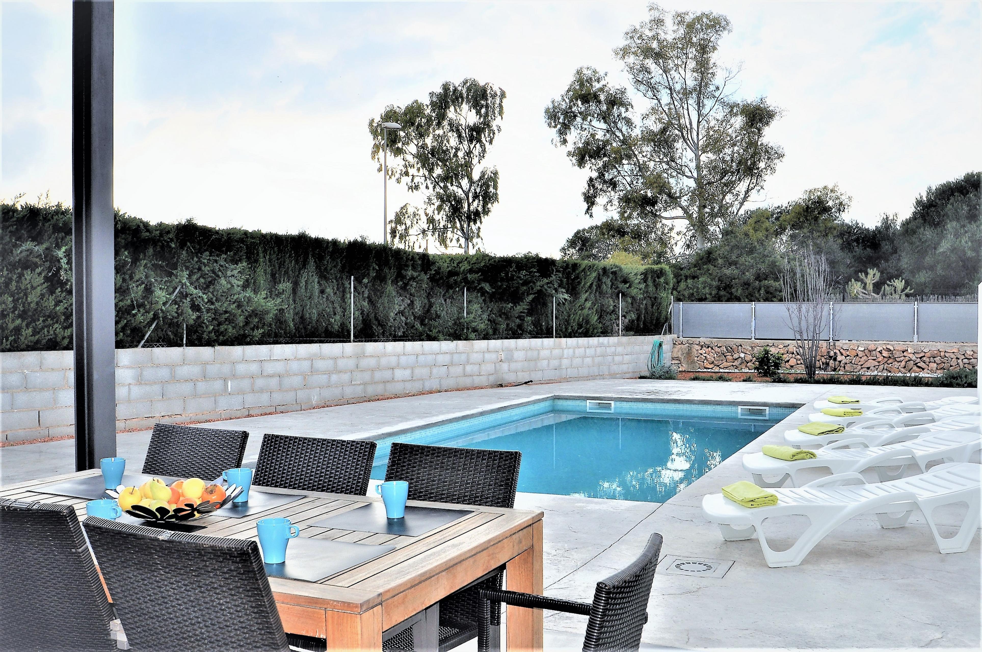 Im Aussenbereich befindet sich ein privter Pool ( 8x4 m Länge, 1,1 m-2m Tiefe), 5 Sonnenliegen, ein Grill, Garten und eine Veranda von 45 m2.