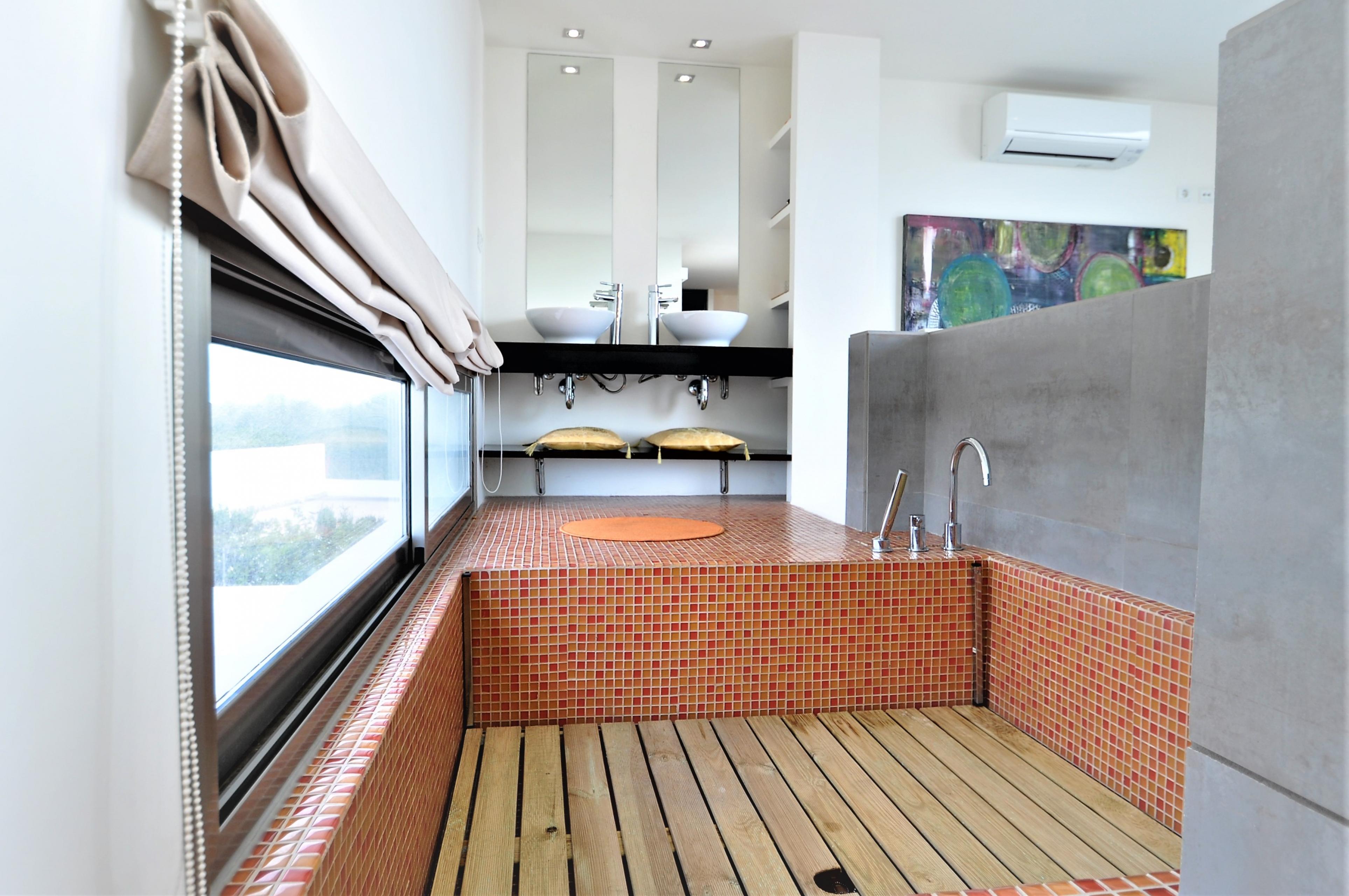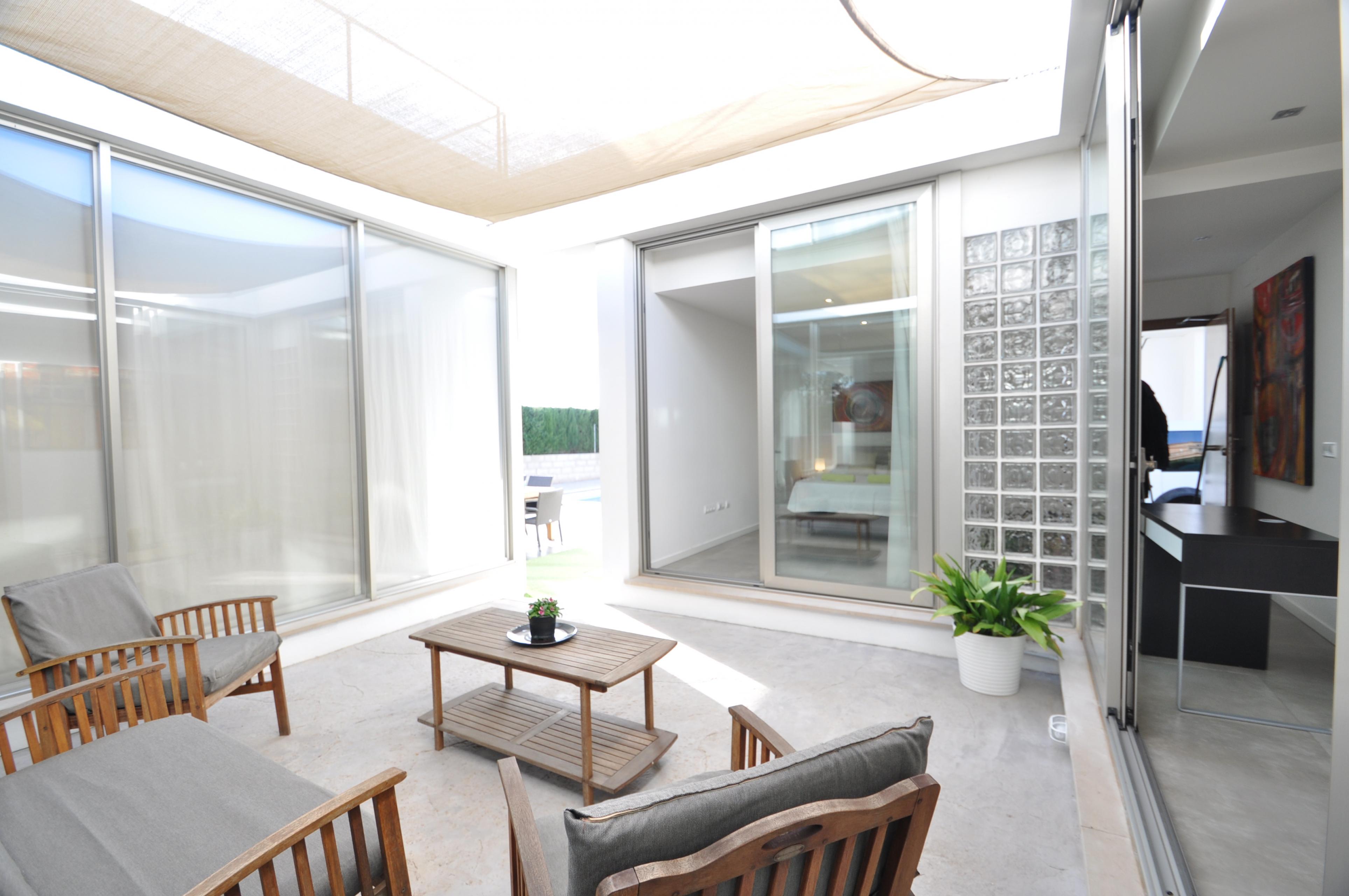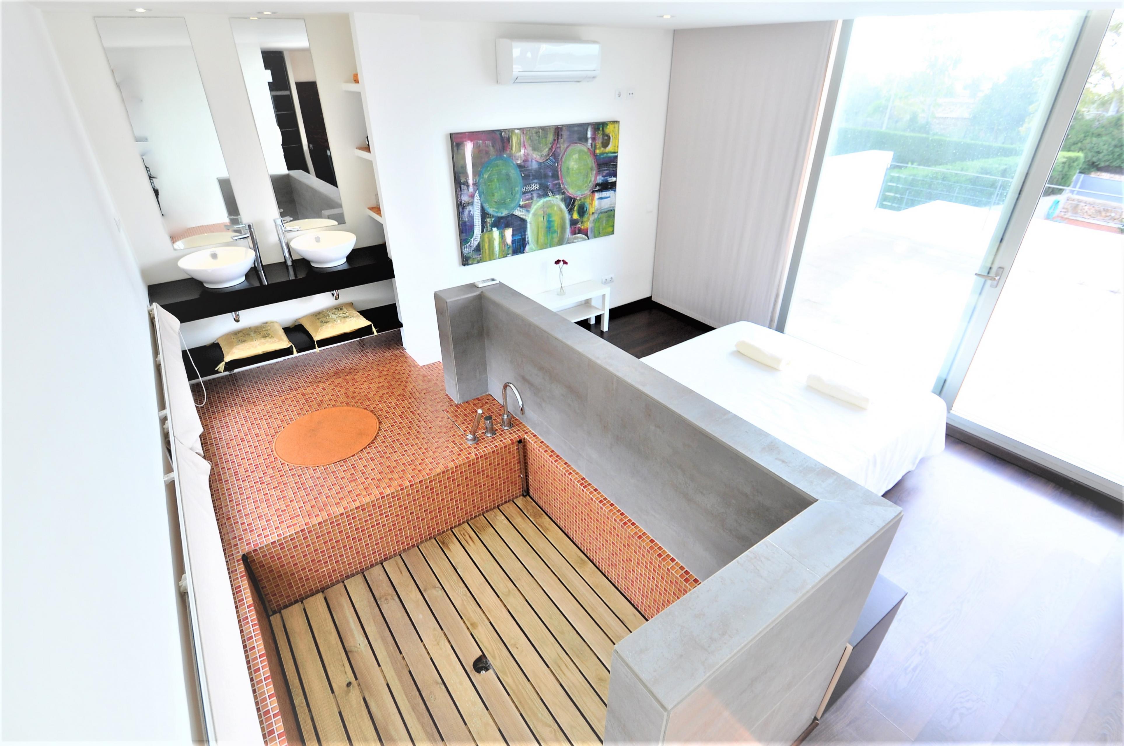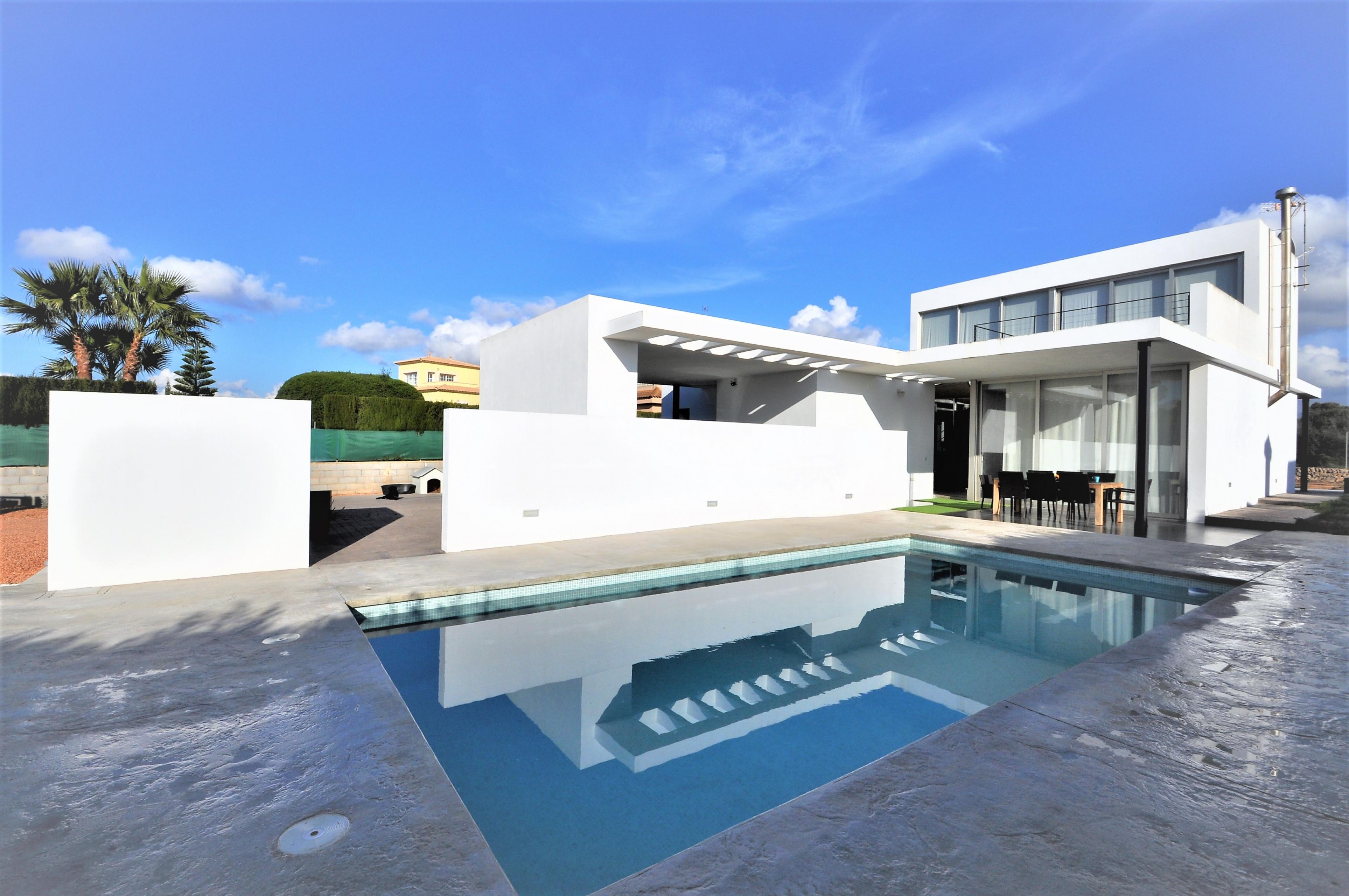 Im Aussenbereich befindet sich ein privter Pool ( 8x4 m Länge, 1,1 m-2m Tiefe), 5 Sonnenliegen, ein Grill, Garten und eine Veranda von 45 m2.