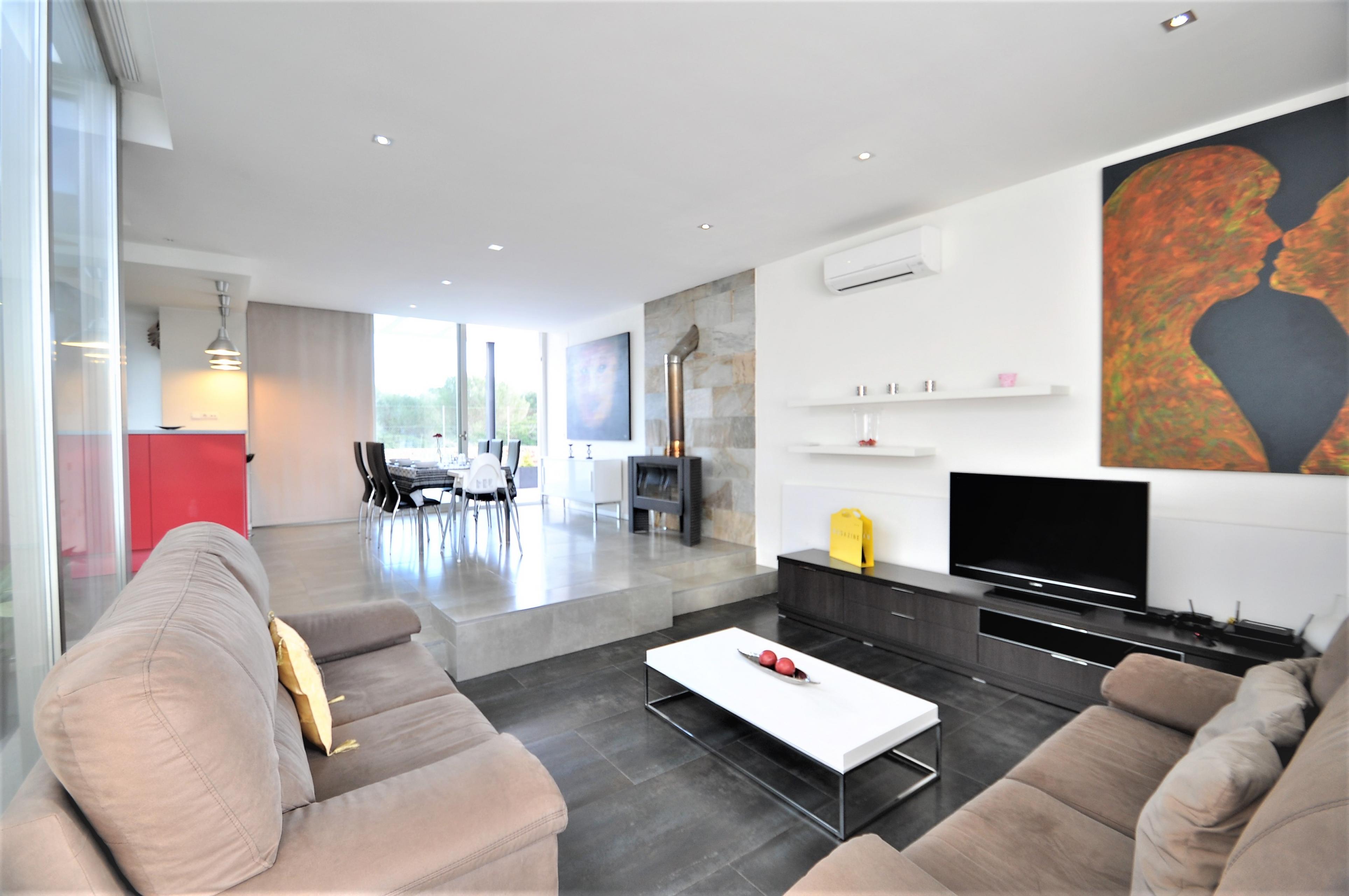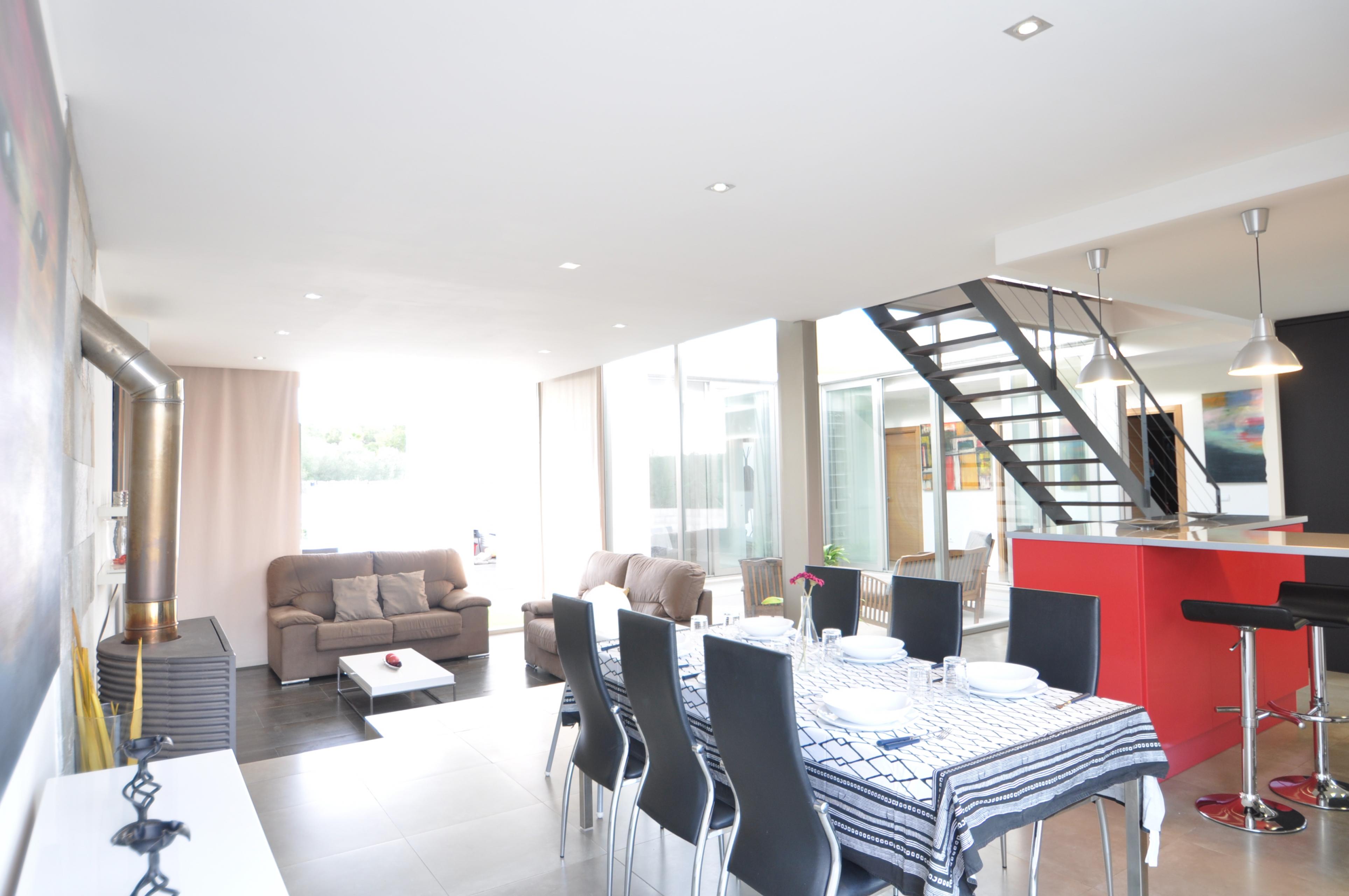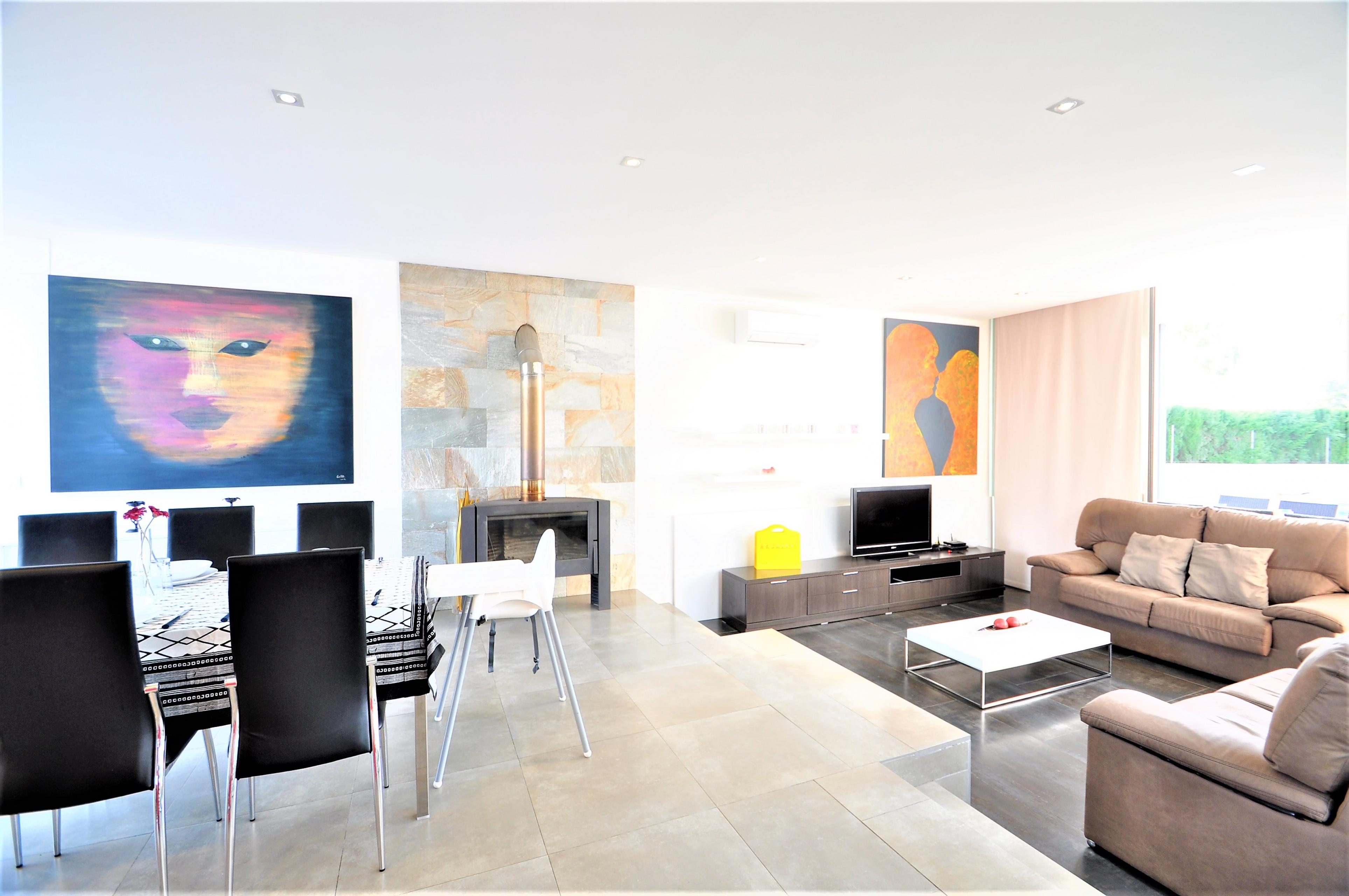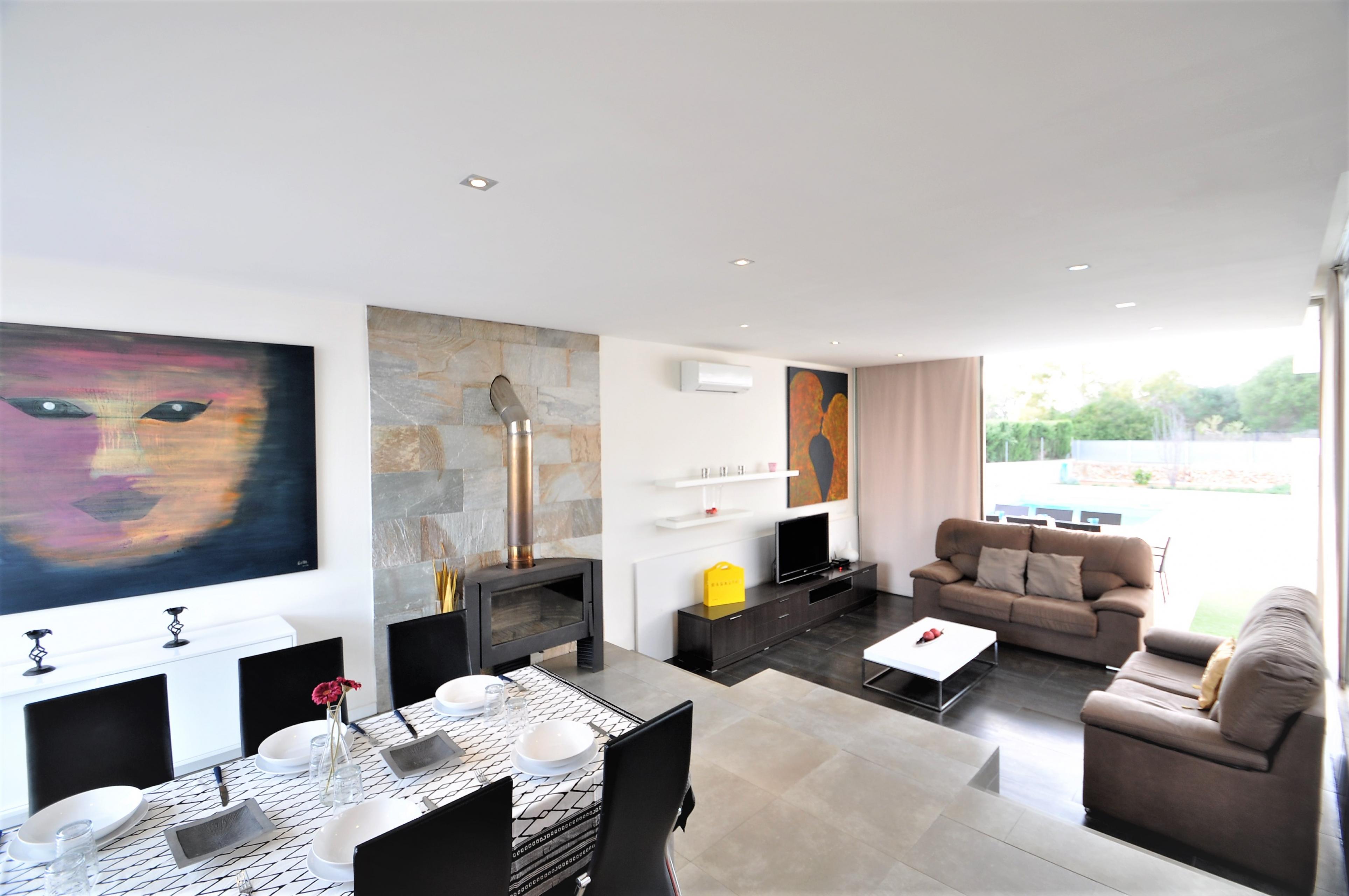 Dieses moderne Haus ist aufgeteilt in 4 Schlafzimmer , 3 davon mit Doppelbetten ( 2 von 135 cm und 1 von 150 cm Breite). Das 4. verfügt über 2 Einzelbetten. Die Schlafzimmer haben Klimaanlage, ebenso wie das Wohnzimmer.Im Esszimmer befinden sich Tisch und Stühle für 6 Personen. Es gibt einen Kamin, Sat TV und Internet.