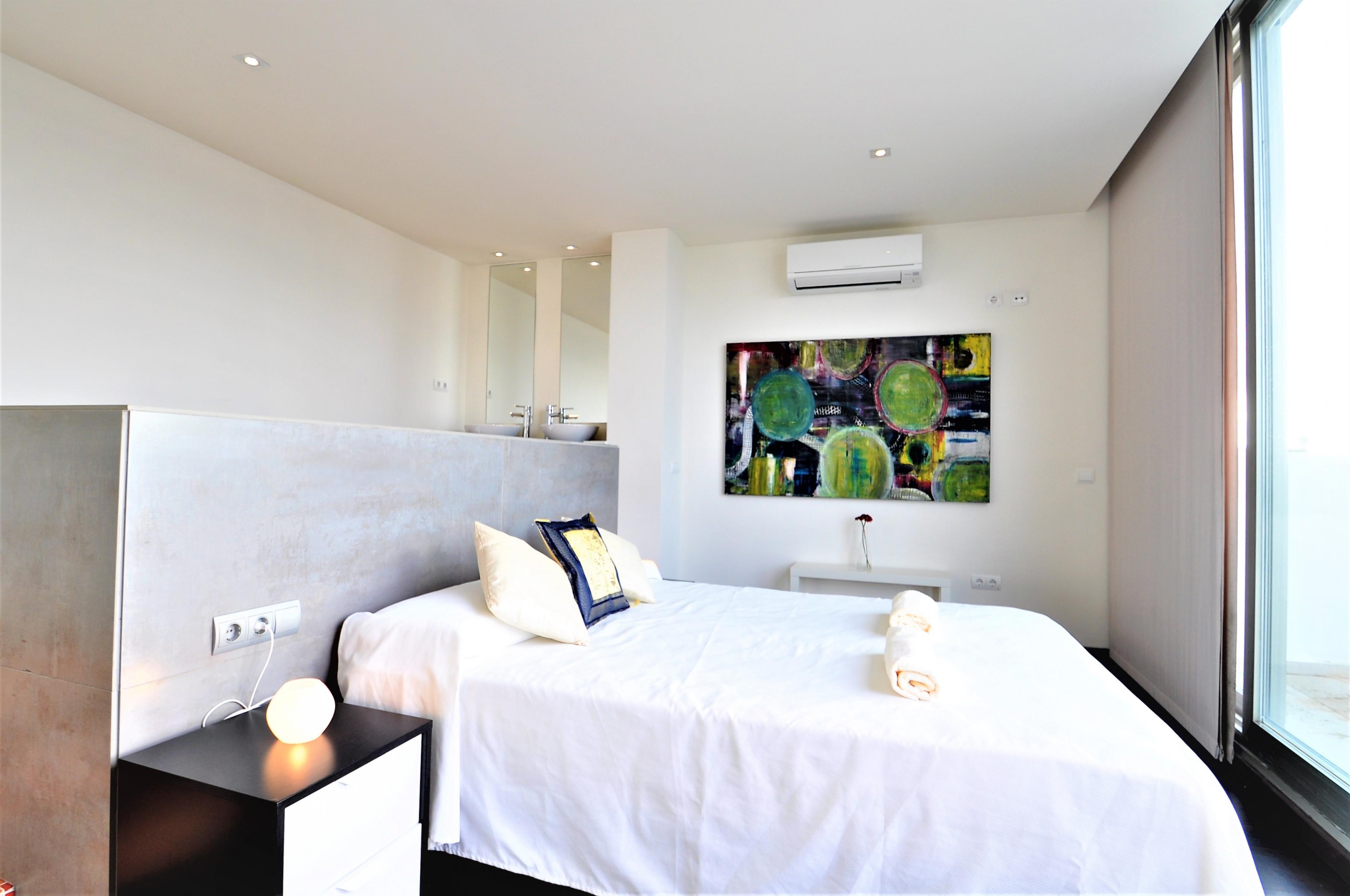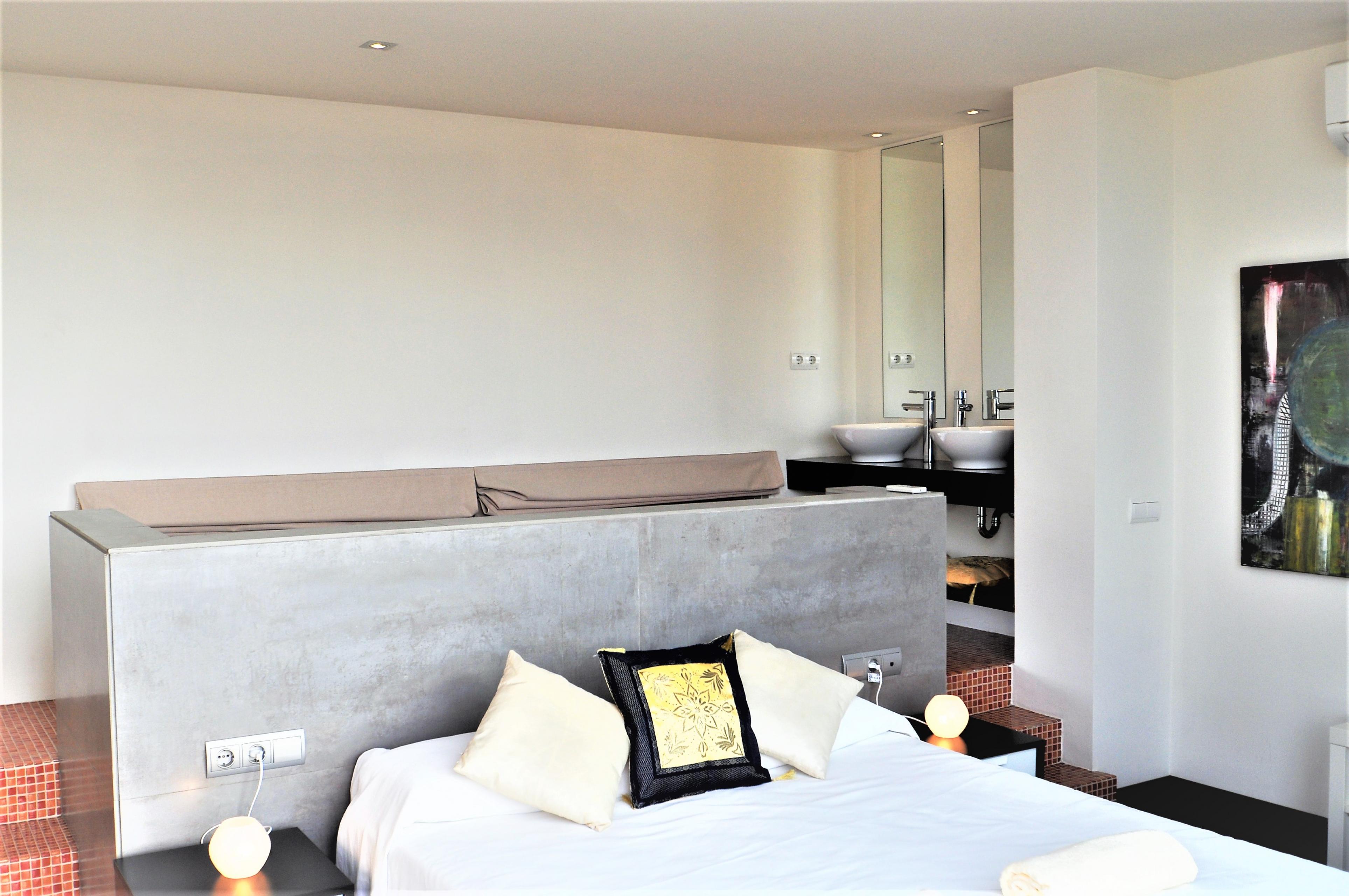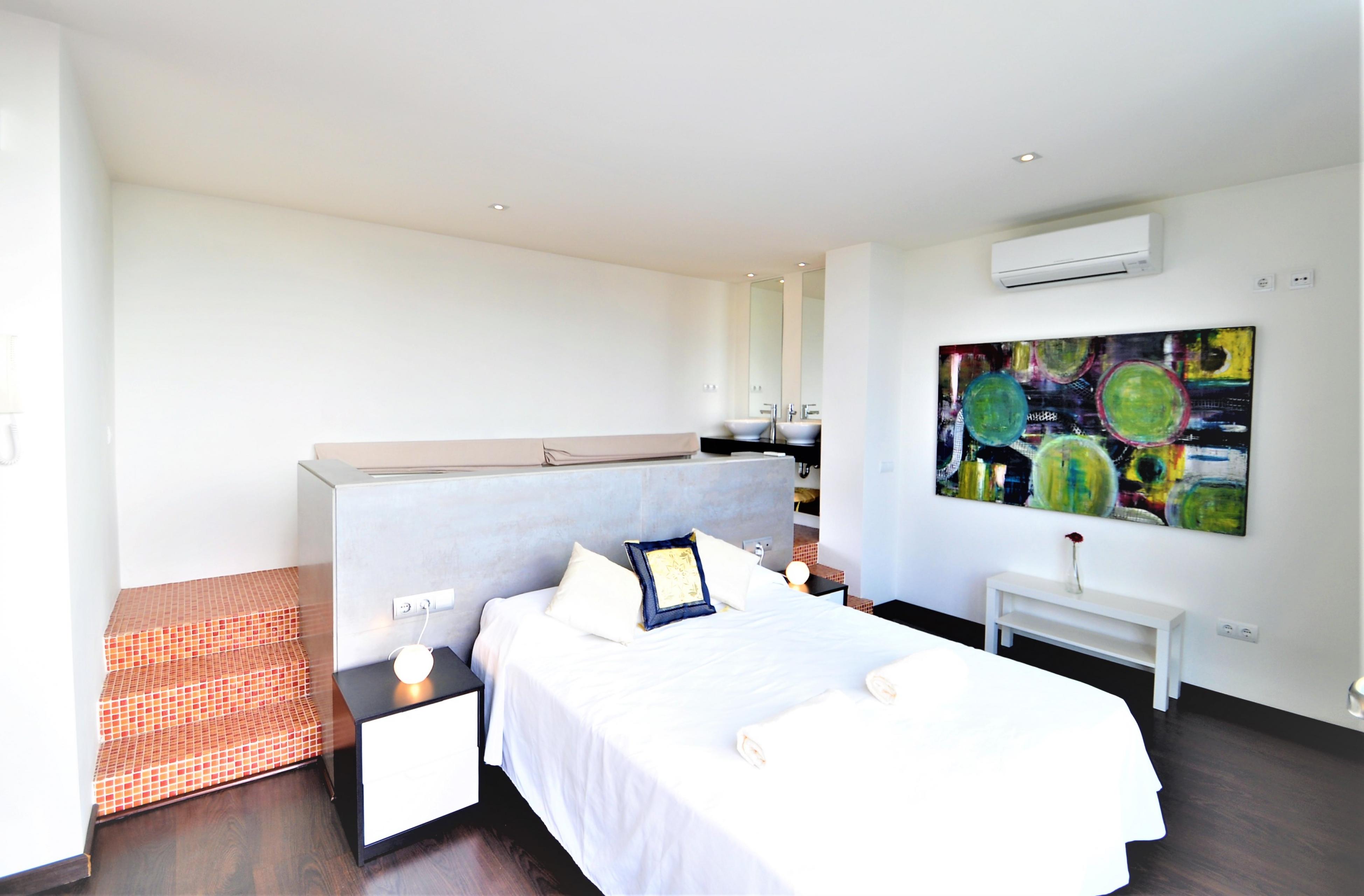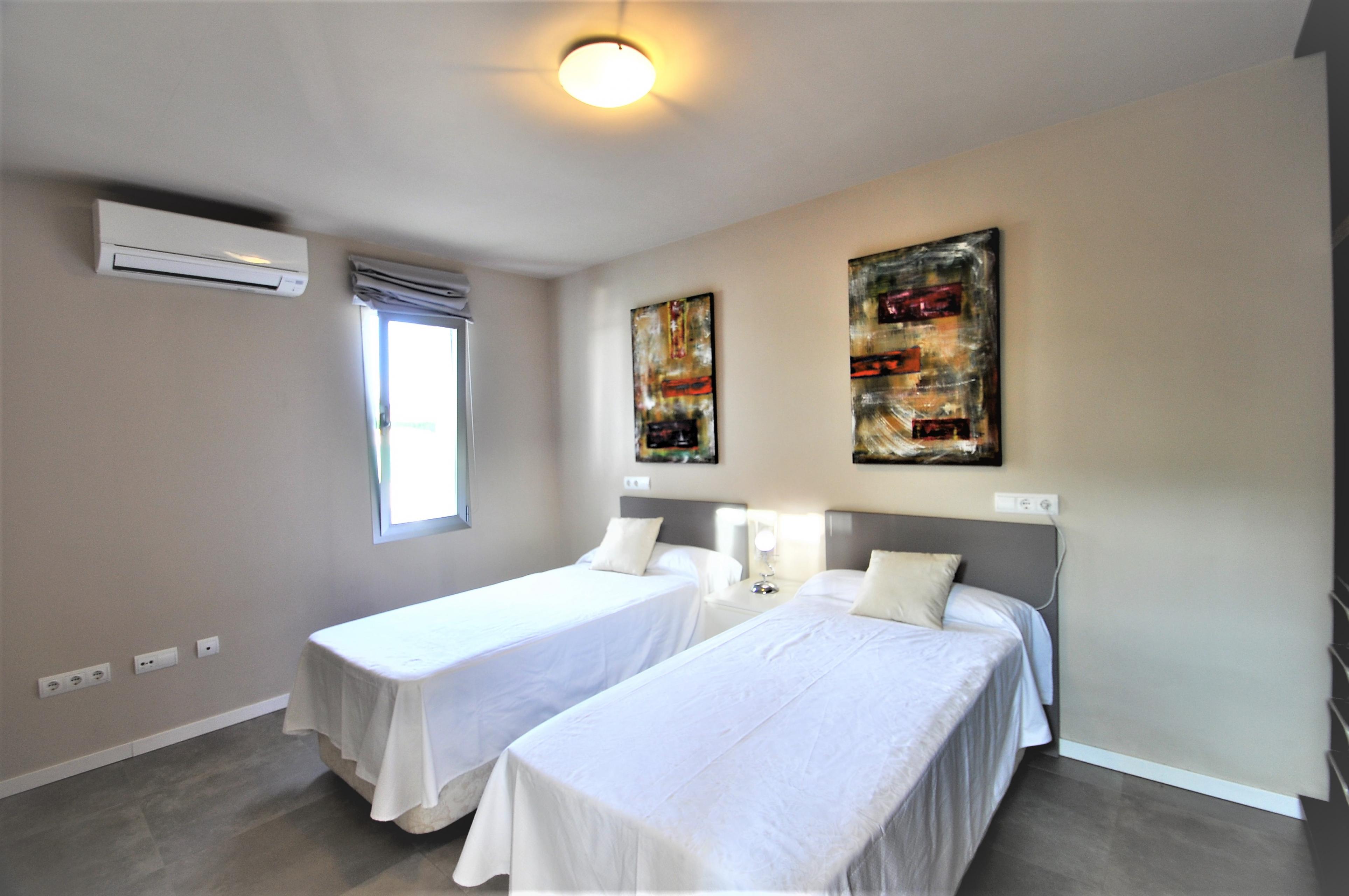 Dieses moderne Haus ist aufgeteilt in 4 Schlafzimmer , 3 davon mit Doppelbetten ( 2 von 135 cm und 1 von 150 cm Breite). Das 4. verfügt über 2 Einzelbetten. Die Schlafzimmer haben Klimaanlage, ebenso wie das Wohnzimmer.Im Esszimmer befinden sich Tisch und Stühle für 6 Personen. Es gibt einen Kamin, Sat TV und Internet.