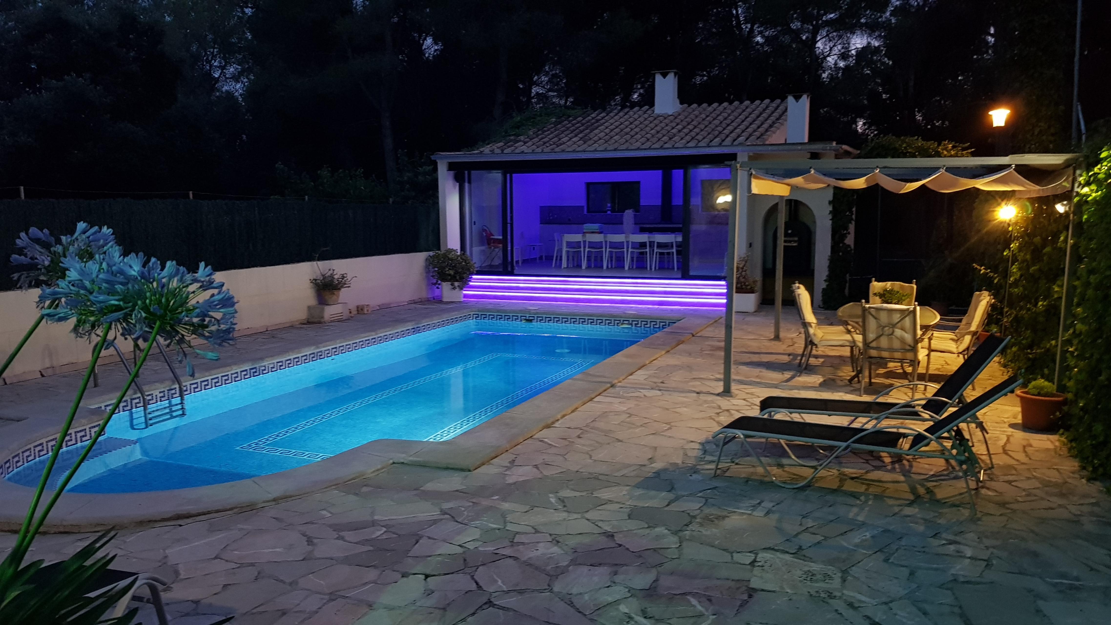Das Grundstück misst ca 1000 m2 , mit eingezäuntem Garten, Pool mit 8x4 m , Sonnenliegen und Schirmen, Gartenmobiliar, Grill und Aussendusche.
